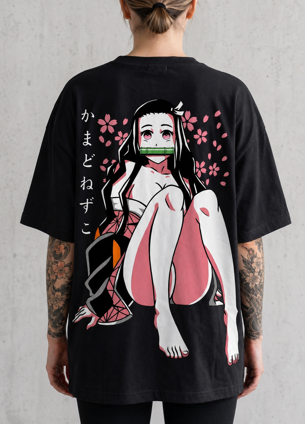 Level up your outfit with this eye-catching tee featuring a striking illustration inspired by Nezuko from Demon Slayer, reimagined with a modern, edgy twist. The combination of soft pink tones, deep blacks, and cherry blossom details creates a powerful contrast that instantly grabs attention.